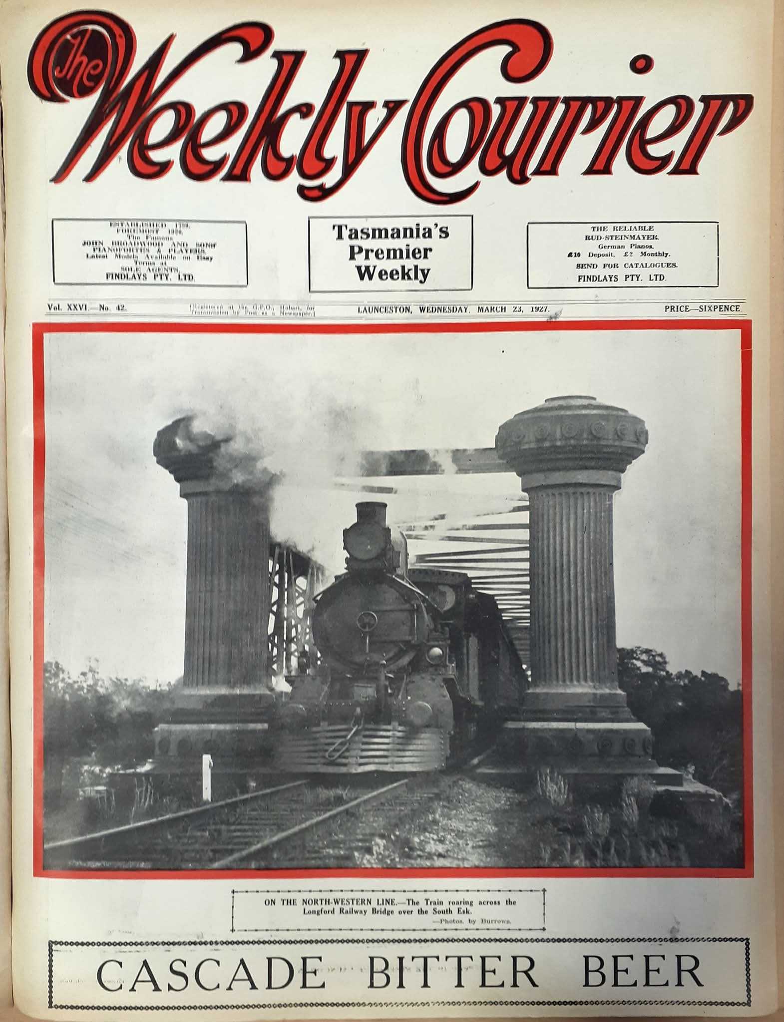 Captions: TasRail’s newly refurbished 2053 stands proudly between the replica columns on Longford’s historic rail bridge(top), recreating this now-famous 1927 image from The Weekly Courier (middle) CEO Steven Dietrich said that TasRail was pleased to support the long-term community-led initiative.