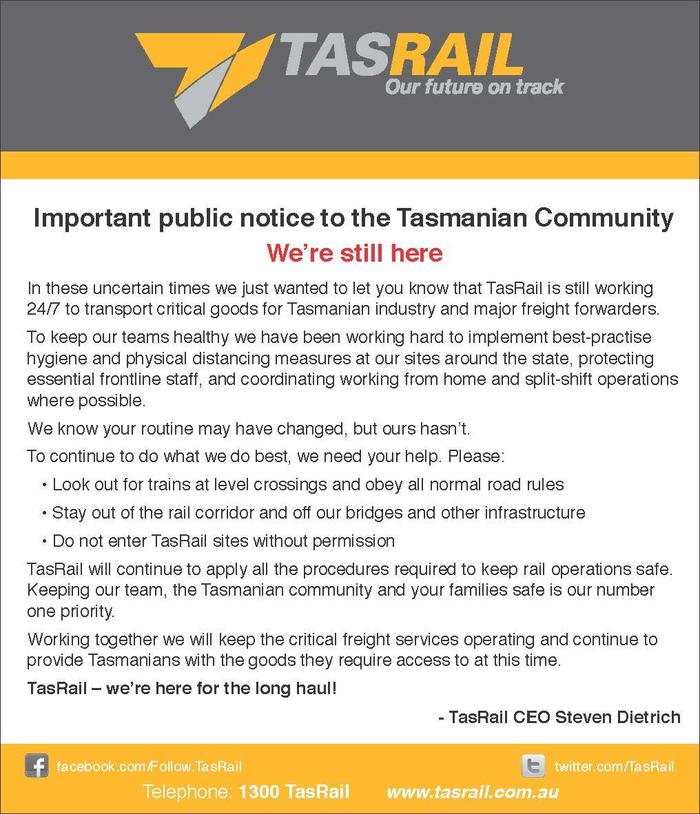 An important notice to alert the public that TasRail is still working 24/7.